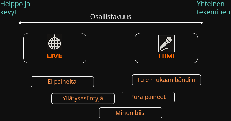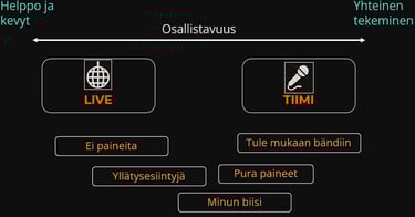 Sekä TIIMI että LIVE perustuvat yhdessä tekemiseen, mutta eri painotuksilla.
